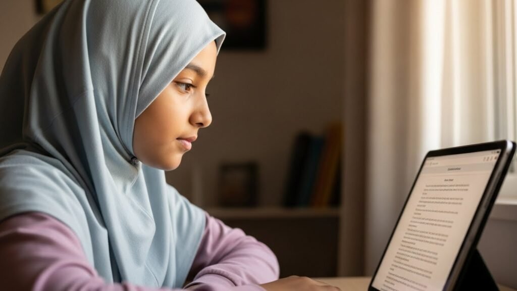 Students follow the UK National Curriculum, including IGCSE and A-Level pathways, taught through live online classes by qualified teachers. The flexible structure allows families to balance learning with personal and spiritual commitments.